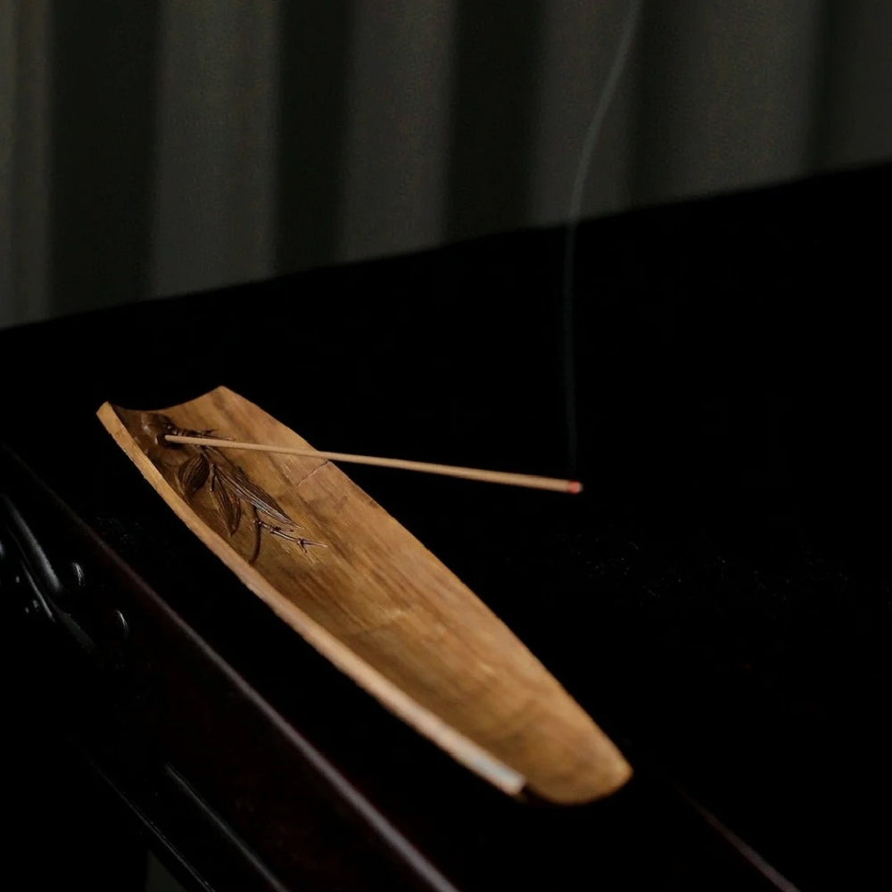 Flat tray for burning incense, typically made of wood or metal.