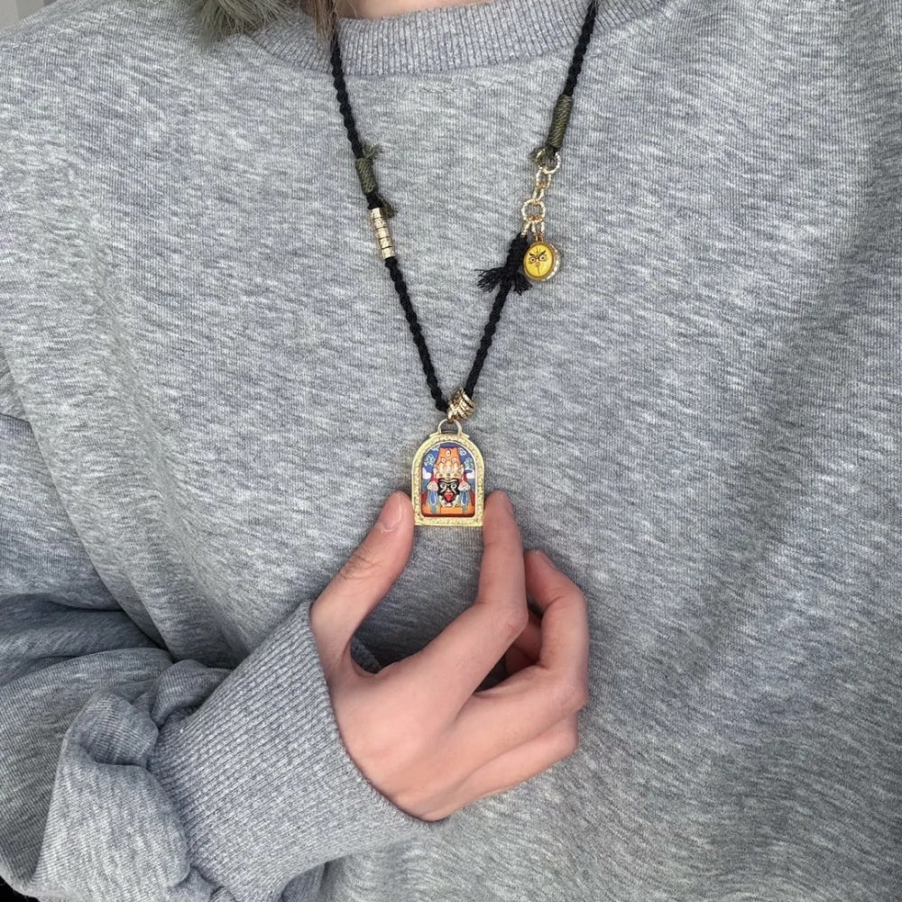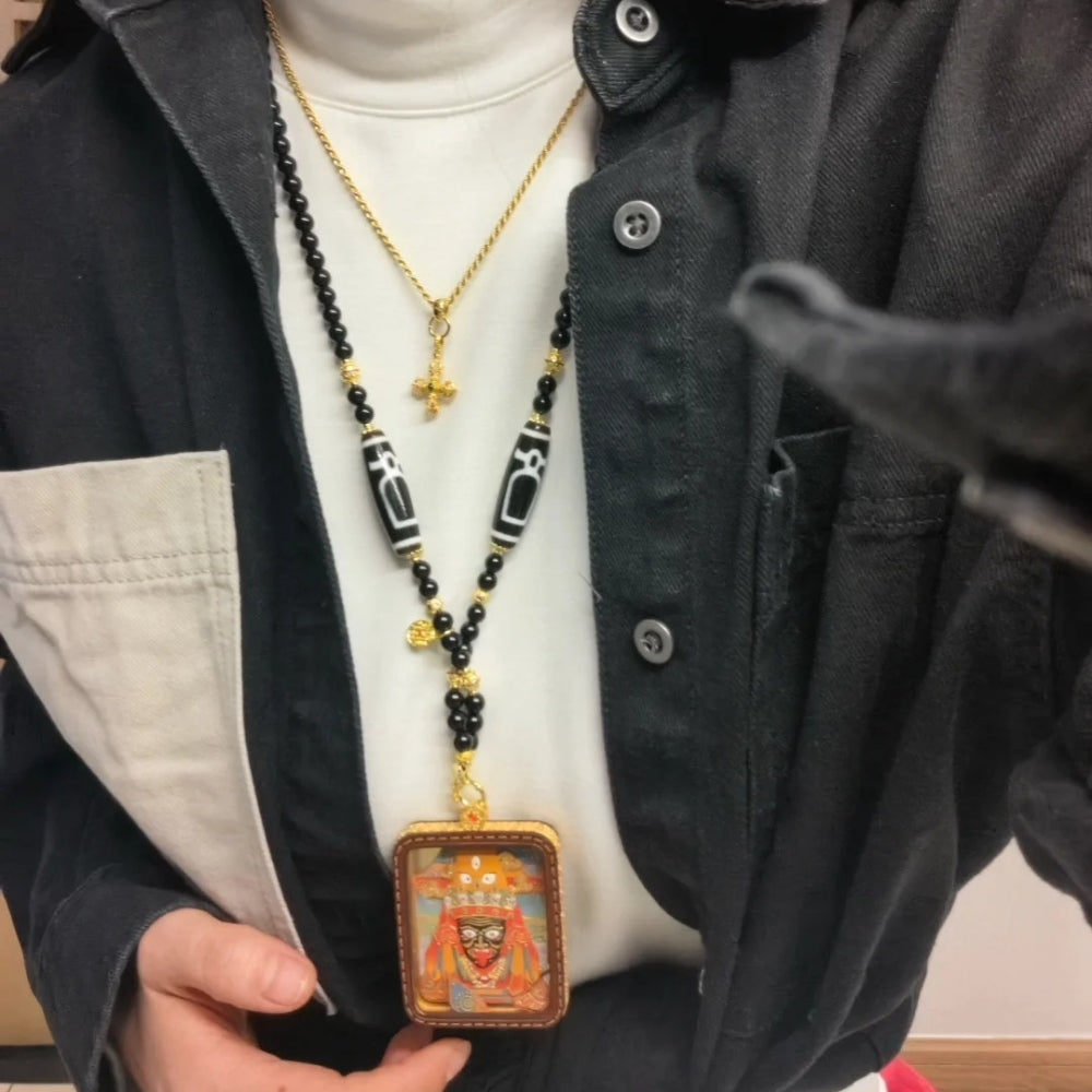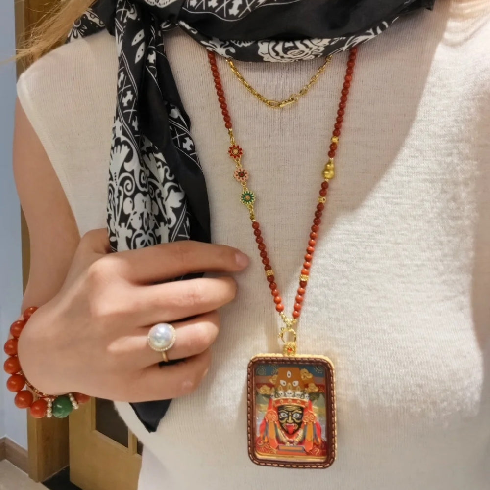 Embrace the beauty and spiritual power of the QiLing Aura Hand-Painted 3D Thangka Brass Buddha Pendant Necklace, designed with a traditional Gawu Box.