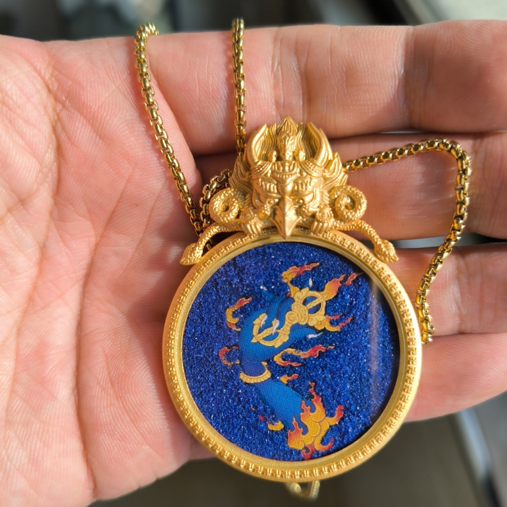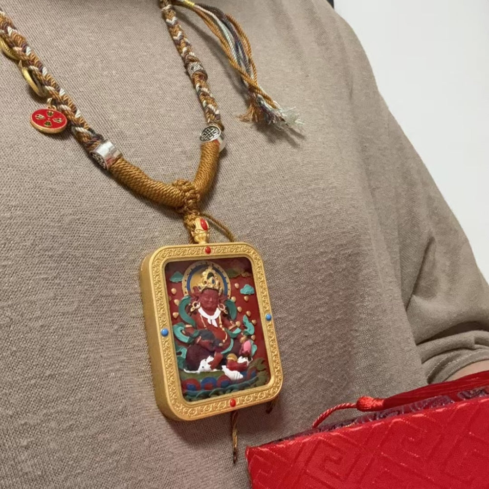 QiLing Aura Hand-Painted 3D Thangka Brass Buddha Pendant Necklace (Gawu Box)